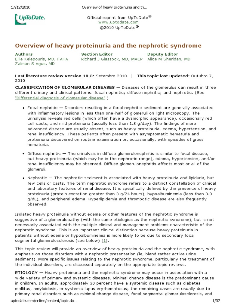 Nephrotic syndrome up to date. Nephrotic syndrome usually happens when the glomeruli are inflamed allowing too much protein to leak from your blood into your urine. Nephrotic syndrome NS consists of peripheral edema heavy proteinuria and hypoalbuminemia often with hyperlipidemia. Nephrotic syndrome in pregnancy poses risks with both maternal and fetal complications.