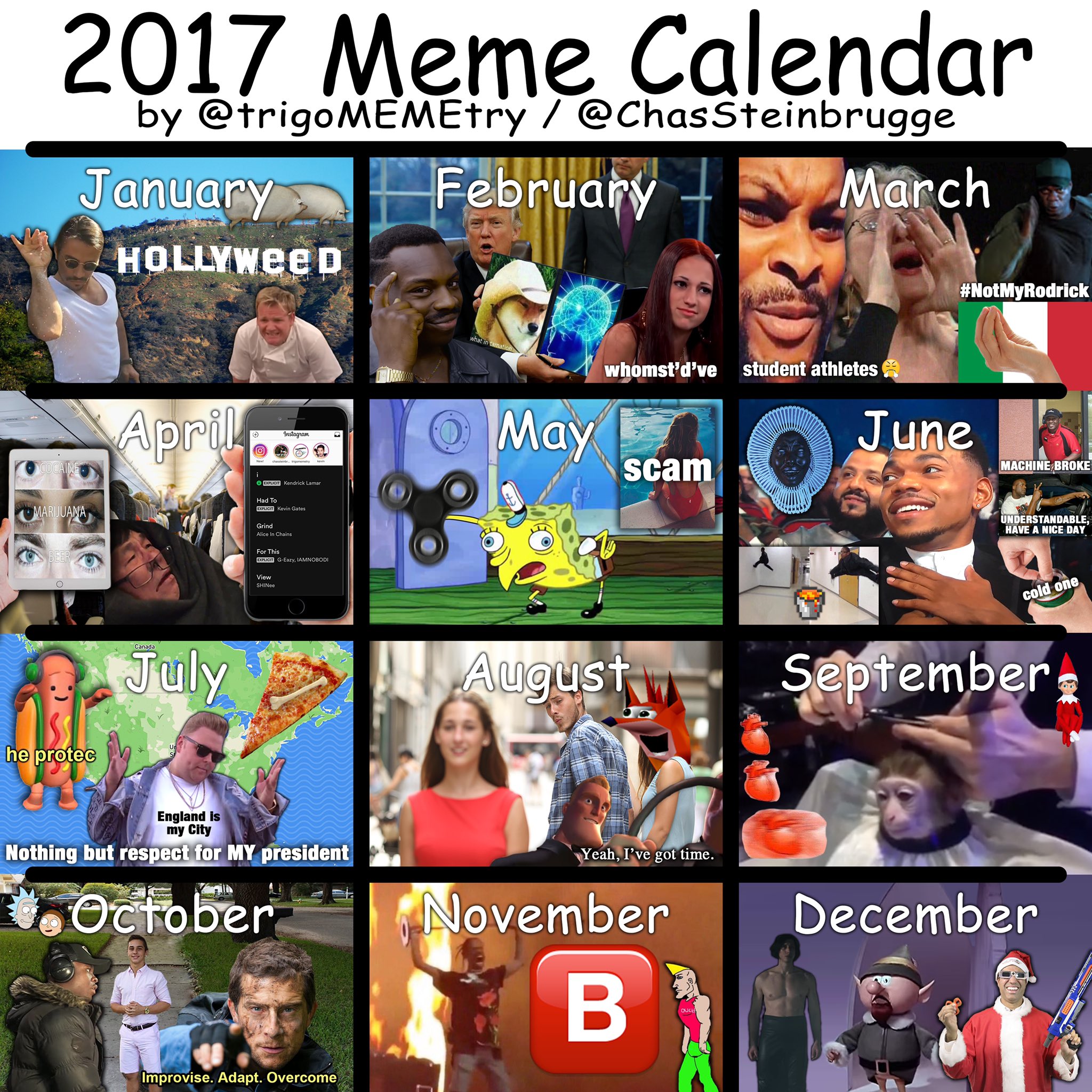 Hmm I recognize less than half of those. The first ever Meme Calendar application is finally here. Facebook gives people the power to share. MOTM October by uMemeCalendar. 2017 Meme Calendar Revised. Hellodean Dec 30 2017. Did i miss the whole of September or something that meme does not seem familiar at all. Meme Calender 2018Explore FactExploreFactsmeme calendar 2018 indiameme calendarmeme calendar 201716bestmemesfunny posts on instagramfunny posts on social med. Share your thoughts experiences and the tales behind the art.