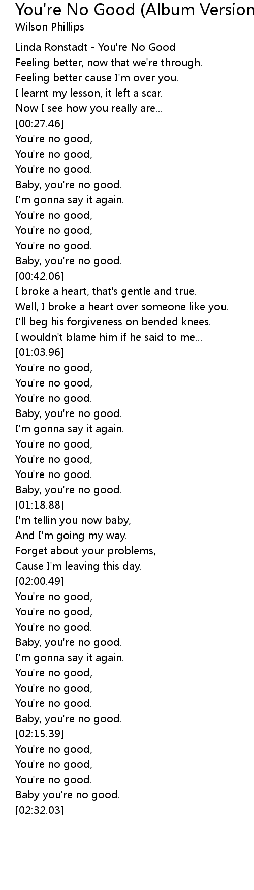 Well I left a boy for someone like you. I broke a heart thats gentle and true. Provided to YouTube by Universal Music GroupYoure No Good Linda RonstadtThe Best Of Linda Ronstadt. Feeling better now that were through Feeling better cause Im over you I learned my lesson it left a scar Now I see how you really are Youre no good Youre no. I broke a heart simple and true. YOURE NO GOOD Ballard Betty Everett - 1963 Swinging Blue Jeans - 1964 The Three Souls - 1965 Manfred Mann - 1966 Rosie Hamlin - 1969 Linda Ronstadt - 1974 Little Milton - 1974 Michael Bolton - 1975 Van Halen - 1979 Reba McEntire - 1998 Feeling better now that were through Feeling better cause Im over you Ive learned my lesson it left a scar Now I see how you really are Youre no good. Ill beg his forgiveness on bended knee. Youre No Good Lyrics. Feeling better now that were through Feeling better cause Im over you I learned my lesson it left a scar Now I see how you really are Youre no good Youre no good.